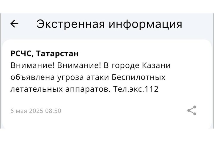 В Казани в 08:50 МЧС объявило об угрозе атаки беспилотных летательных аппаратов (БПЛА). Об этом сообщили в приложении ведомства.