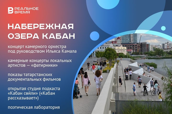 Летняя программа на набережной озера Кабан в этом году охватит благоустроенную территорию у нового здания театра Камала. Там пройдет концерт камерного оркестра под руководством Ильяса Камала. В программе — творения татарских классиков и современных композиторов республики.
