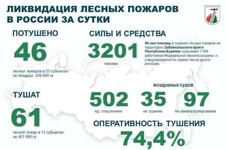 Для стабилизации ситуации в наиболее сложных регионах — Забайкальском крае и Бурятии — направлены дополнительные силы в количестве 1059 работников Федеральной Авиалесоохраны и др.
