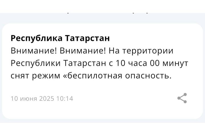 На всей территории Татарстана с 10.00 снят режим «Беспилотная опасность». Информация об этом появилась в приложении МЧС.