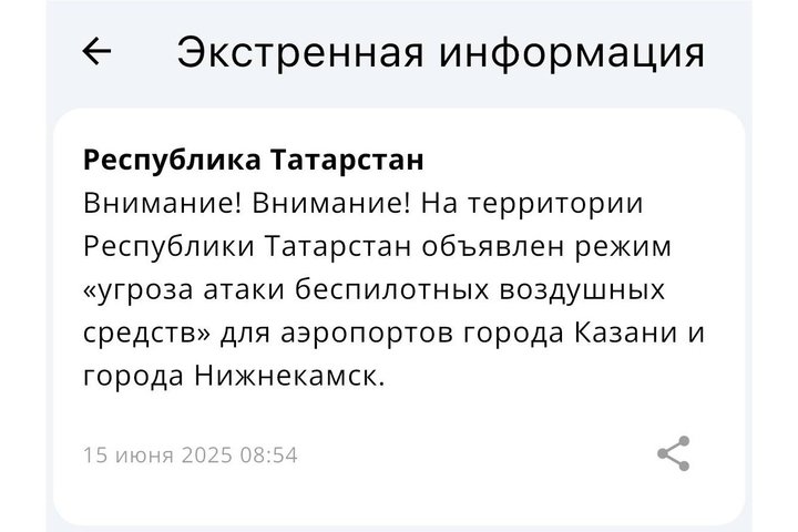В Татарстане объявлен режим «Угроза атаки беспилотных воздушных средств» для аэропортов Казани и Нижнекамска. Об этом сообщили в пресс-службе Республиканской системы предупреждения и ликвидации чрезвычайных ситуаций (РСЧС).