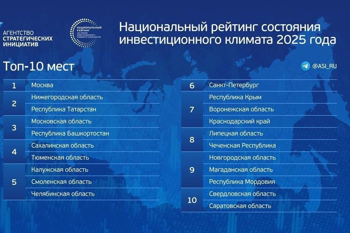 Путин упомянул, что 57 регионов России улучшили свои показатели в рейтинге инвестиционной привлекательности, подготовленном Агентством стратегических инициатив (АСИ). Лидеры рейтинга — Москва, Татарстан и Нижегородская область, которые разделили второе место. Президент подчеркнул, что улучшение делового климата и создание благоприятных условий для бизнеса остаются приоритетными задачами.