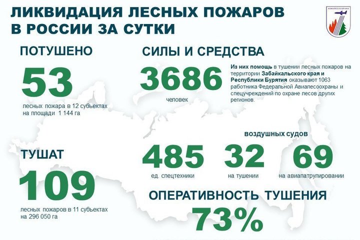 Для поддержки регионов в стабилизации ситуации с лесными пожарами на территории Забайкальского края и Бурятии привлечены 1 063 сотрудника Федеральной Авиалесоохраны и специализированных учреждений по охране лесов регионов.