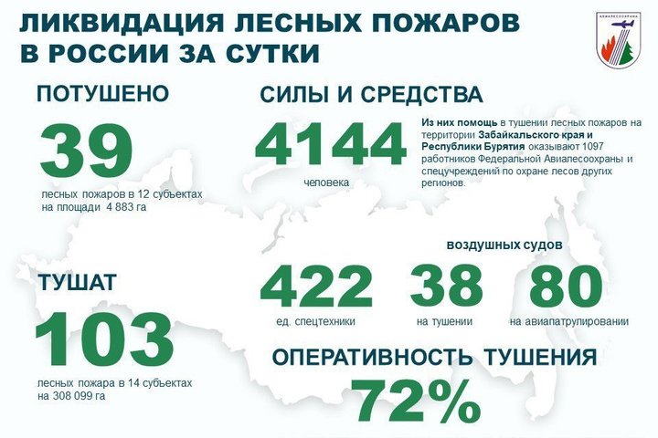 Для поддержки регионов в стабилизации ситуации с лесными пожарами на территории Забайкальского края и Бурятии привлечены 1 097 сотрудников федеральной «Авиалесоохраны» и специализированных учреждений по охране лесов регионов.