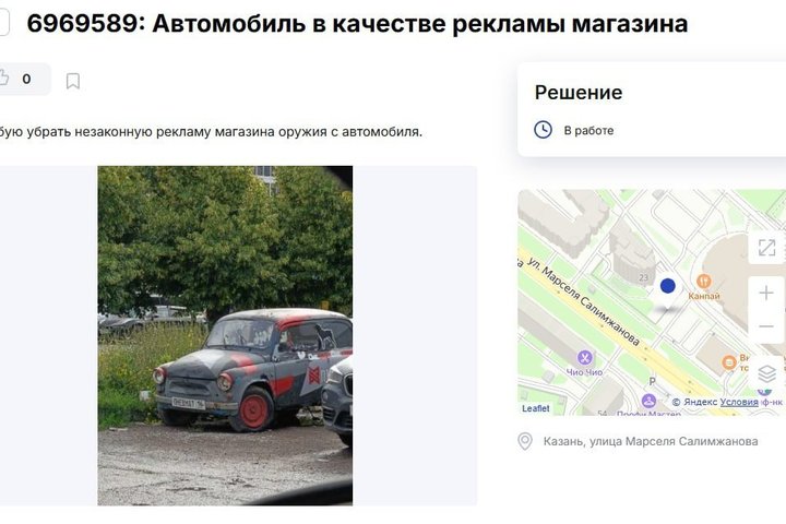 Редакция «Реального времени» ознакомилась с некоторыми жалобами, опубликованными за последнее время. Так, Анна жалуется на яму около Кремлевской набережной. Вместе с этим на «карте нарушений» можно найти обращения, посвященные отсутствию перевода вывески на татарский язык, регулярное запаздывание общественного транспорта, облезшие малые архитектурные формы в парках, а также автомобили, которые используются для рекламы магазина пневматического оружия или некачественный песок в детской песочнице, из которого никак не лепятся куличики.