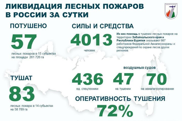 Для поддержки регионов в стабилизации ситуации с лесными пожарами на территории Забайкальского края и Бурятии привлечены 987 сотрудников федеральной «Авиалесоохраны» и специализированных учреждений по охране лесов регионов.