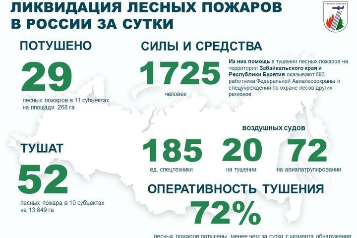Для борьбы с огнем мобилизованы значительные силы и средства. В тушении задействовано 1725 человек личного состава, 185 единиц наземной техники, а также 20 воздушных судов, непосредственно участвующих в операциях по ликвидации возгораний. Кроме того, на авиационном мониторинге лесопопожарной обстановки находятся 72 воздушных судна.