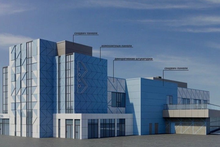 По представленным рендерингам, здание будет отделано сэндвич-панелями, декоративной штукатуркой и композитными панелями