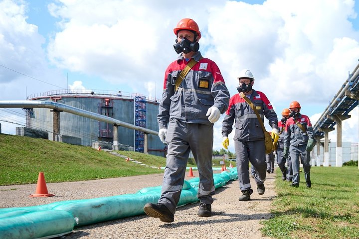 Учения начались с сообщения в диспетчерскую о резком снижении уровня мазута в резервуаре №4. По громкой связи звучит требование к работникам станции покинуть опасное место, куда уже выдвигаются бойцы НАСФ, облаченные в специальные костюмы.