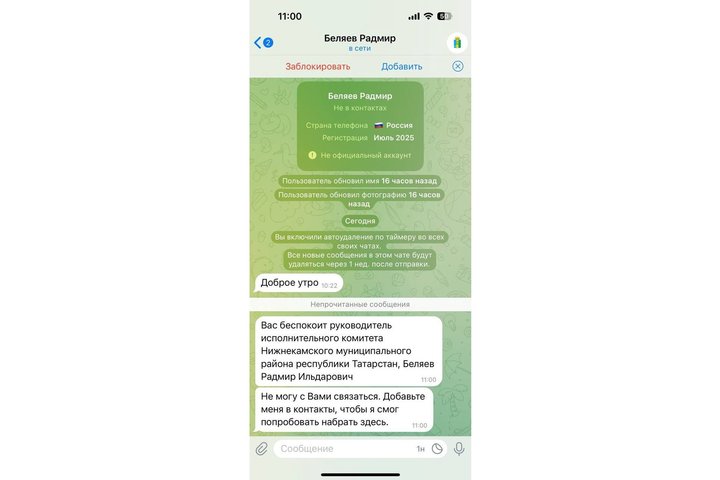 — Дорогие нижнекамцы, коллеги, друзья, хочу предупредить о телефонных мошенниках, которые пишут от моего имени! — написал Беляев.