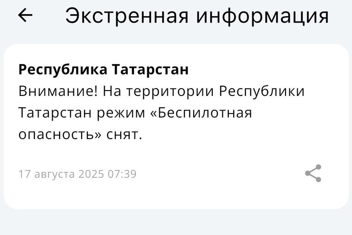 В Татарстане сняли режим «Беспилотная опасность». Сообщение об этом появилось в приложении МЧС.