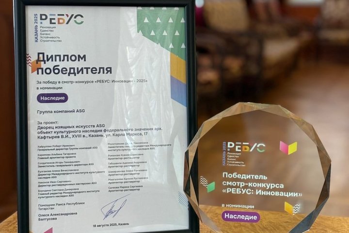 Инновационный проект компании — Дворец изящных искусств ASG — стал победителем конкурса «Ребус: Инновации» в номинации «Наследие». Торжественное награждение состоялось в Присутственных местах Кремля на заседании секции «Общественные пространства и культурное наследие в них».