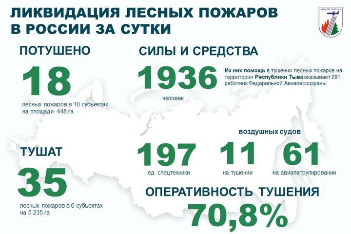 В тушении задействовано 1 936 человек, 197 единиц техники и 11 воздушных судов. Авиационный мониторинг лесопожарной обстановки осуществляет 61 воздушное судно.