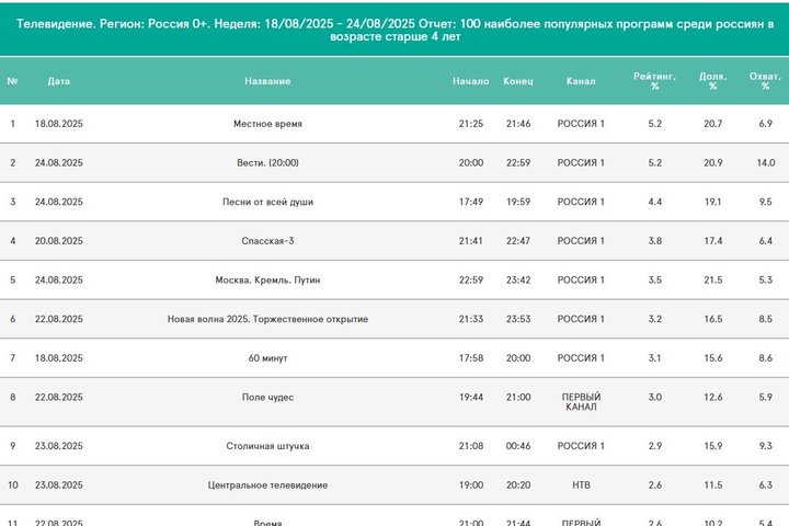 За период с 18 по 24 августа эфир оказался на шестой строчке по популярности среди телезрителей