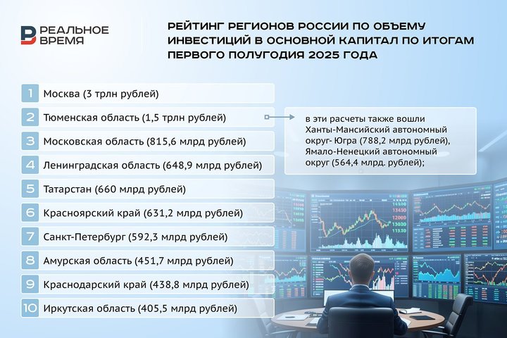 По итогам первого полугодия 2025 года Татарстан занял пятое место среди регионов России по объему инвестиций в основной капитал, подсчитало «Реальное время» на основе данных Росстата.