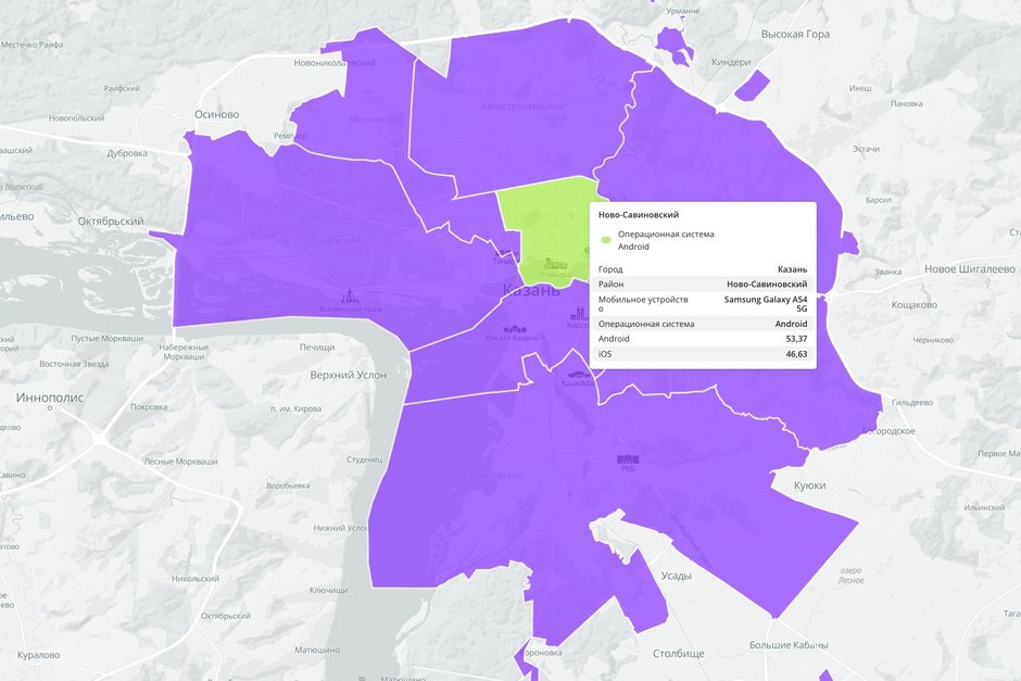 Особенно высокий показатель зафиксирован в Авиастроительном районе города, где доля iOS достигает 77%. Лидером по Android стал Ново-Савиновский район города — 53%.