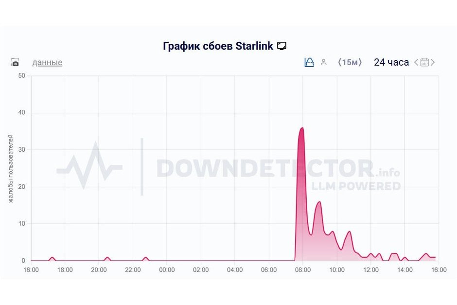 Несмотря на опровержение прямого влияния магнитной бури, сервис Downdetector зафиксировал 188 жалоб на сбои в работе Starlink в период с 07:30 до 10:45.