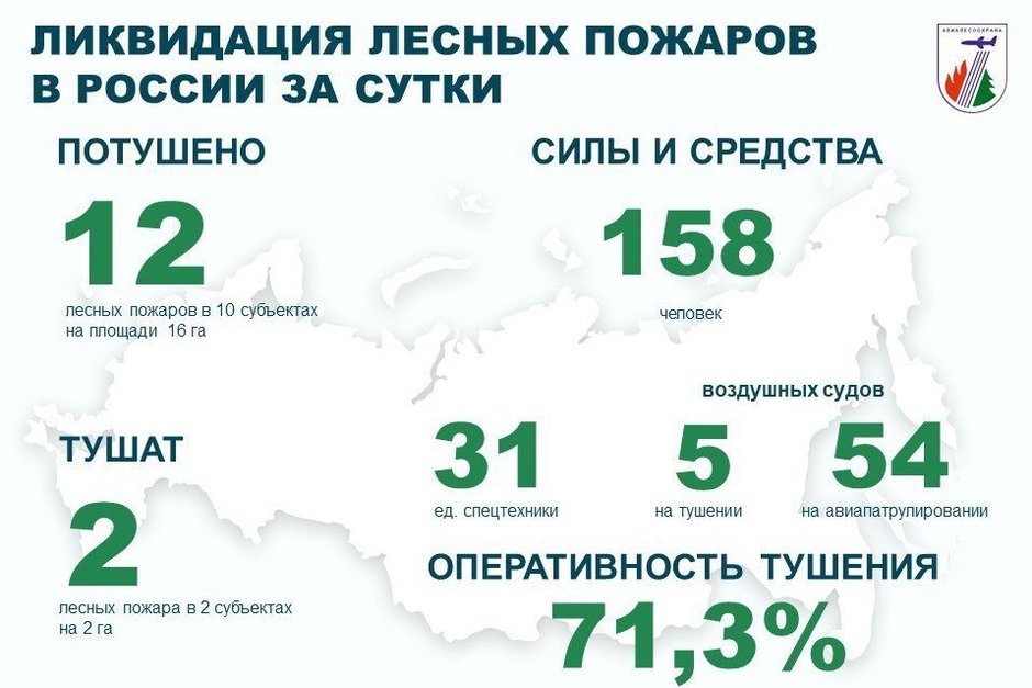 За прошедшие сутки в России удалось ликвидировать 12 лесных пожаров в 10 регионах страны. В настоящее время продолжаются работы по тушению двух лесных пожаров в двух регионах.