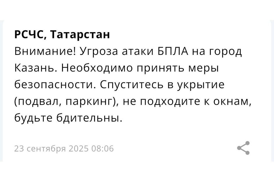 — Внимание! Угроза атаки БПЛА на город Казань. Необходимо принять меры безопасности. Спуститесь в укрытие (подвал, паркинг), не подходите к окнам, будьте бдительны, — сказано в сообщении.