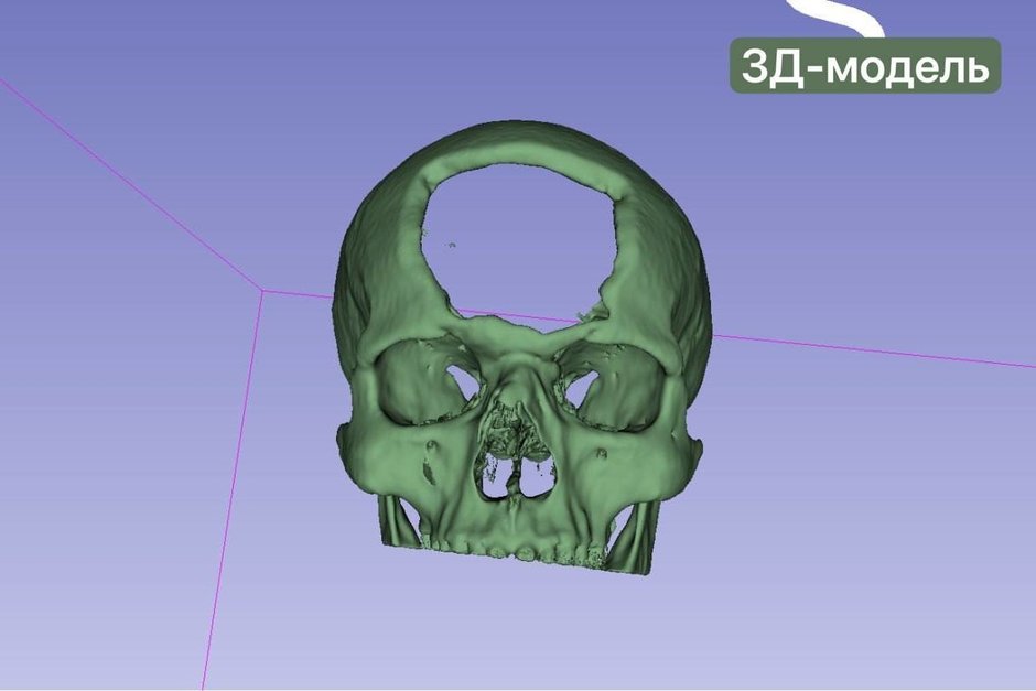 Нейрохирург отделения №2 Никита Николаев, изучив результаты КТ, с помощью специальной программы смоделировал недостающую часть черепа пациента и напечатал ее на 3D-принтере. По полученной модели была изготовлена титановая пластина, соответствующая индивидуальным особенностям.