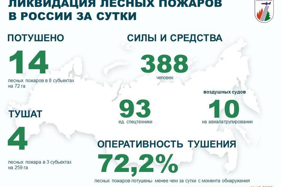 Оперативность тушения лесных пожаров в России остается высокой. С начала года 72,2% лесных пожаров ликвидированы менее чем за сутки с момента обнаружения.