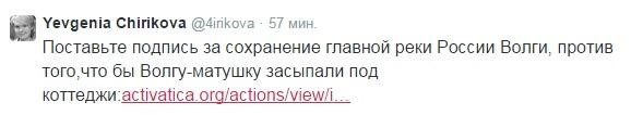 «Поставьте подпись за сохранение главной реки России Волги, против того, чтобы Волгу-матушку засыпали под коттеджи», — написала она в твиттере.