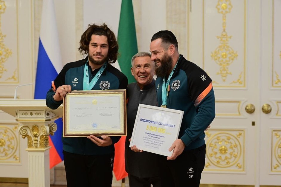 «Уважаемые игроки, тренеры, руководители клуба! Рад приветствовать вас в Казанском Кремле в этот особенный для всех день — сегодня мы чествуем наших чемпионов, регбийный клуб «Стрела-Ак Барс», который завоевал все главные трофеи страны в сезоне 2025 года, — сказал в приветственном слове Рустам Минниханов. — Эти победы стали результатом огромной работы, силы духа и высочайшего мастерства. Решающий матч чемпионата был упорным, зрелищным и захватывающим. Он держал в напряжении до самого финала и принес первый для клуба титул чемпионов страны».