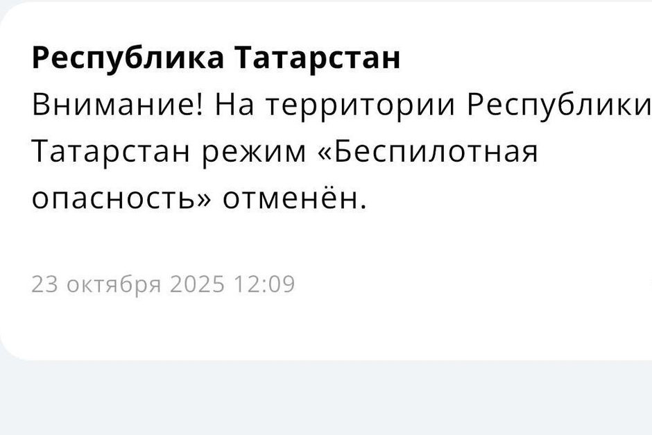 В Татарстане сняли режим «Беспилотная опасность». Он действовал более семи часов — с 04:45 до 12:09 мск. Сообщение пришло в приложении МЧС.