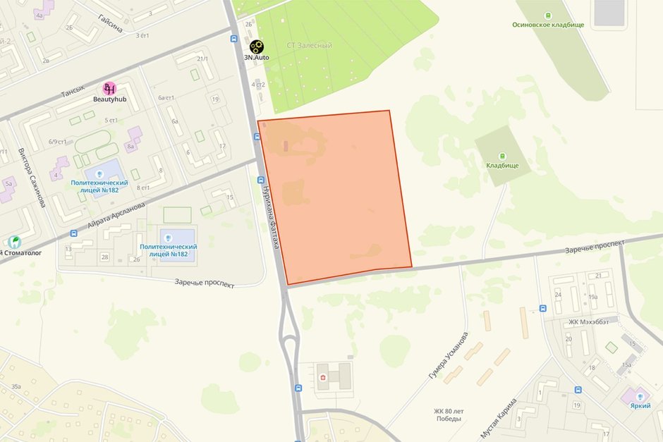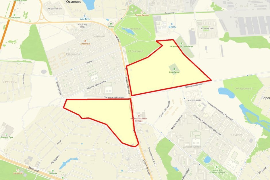 Первый участок площадью 14,9 га расположен в границах улиц Нурихана Фаттаха и Айрата Арсланова, рядом с политехническим лицеем №182. Второй участок площадью 41,9 га находится напротив первого, но на его территории находится кладбище и граничит участок с Осиновским кладбищем, что в перспективе может вызвать сложности для будущих жильцов.