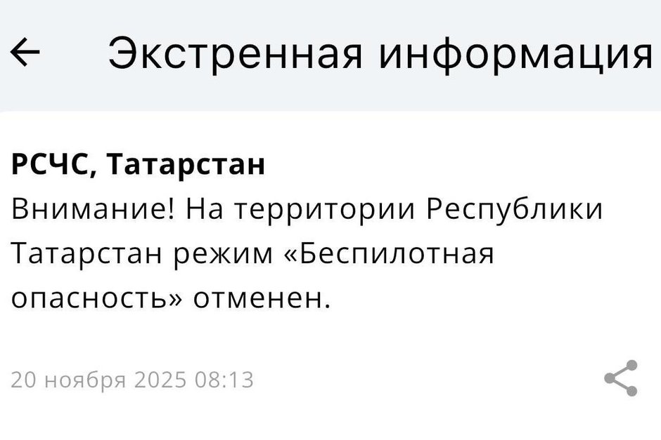 В Татарстане отменили режим «Беспилотной опасности». Он продлился с 04:41 до 08:13 мск. Об этом сообщили в приложении МЧС.