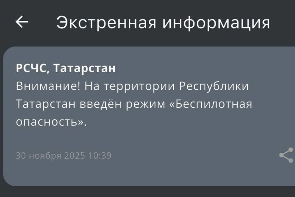 В Татарстане ввели режим «Беспилотная опасность». Об этом сообщили в МЧС.