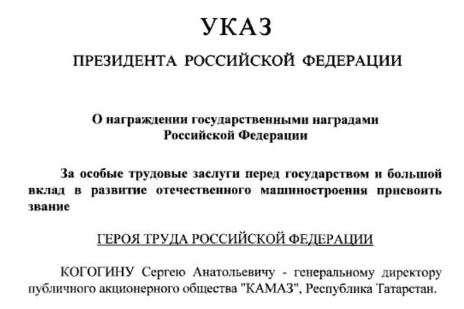 Генеральный директор КАМАЗа Сергей Когогин получил высшую госнаграду за трудовые достижения. Президент России подписал указ о присвоении руководителю предприятия звания Героя Труда России.
