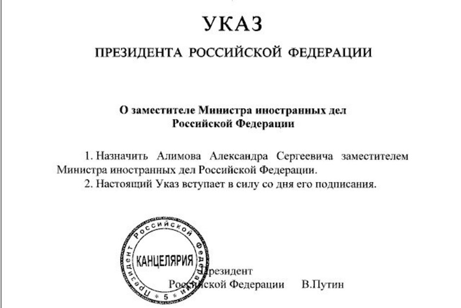 Александр Алимов назначен замглавы Министерства иностранных дел России. Указ подписал Владимир Путин.