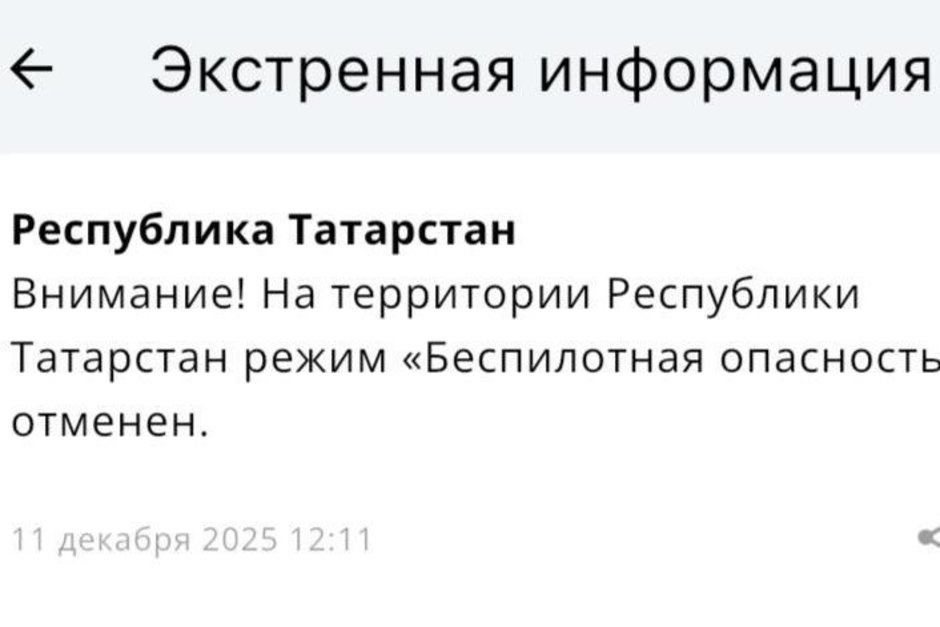 В Татарстане через 1,5 часа отменили режим беспилотной опасности. Сообщение об этом появилось в приложении МЧС.