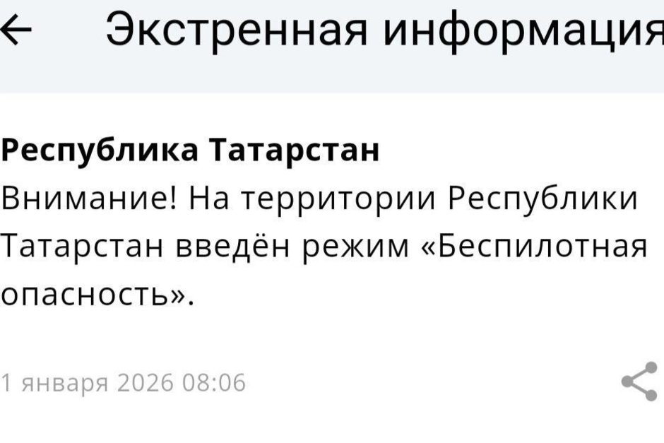 Ранее в Татарстане режим «Беспилотная опасность» вводился ночью 31 декабря, его отменили спустя почти пять часов.