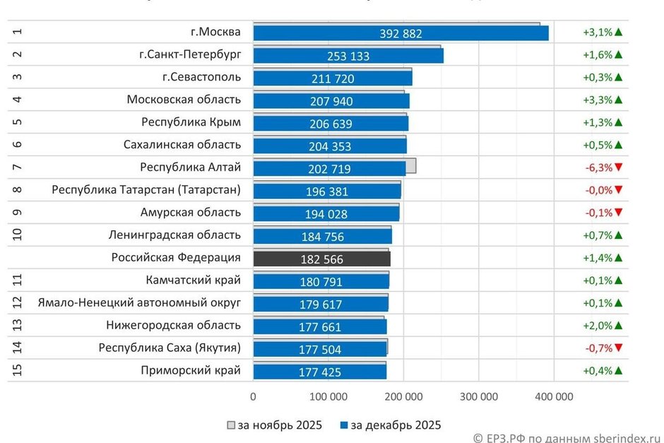 При этом отмечается, что в декабре 2025 года стоимость 1 кв. м в новостройках не изменилась по сравнению с ноябрем того же года.