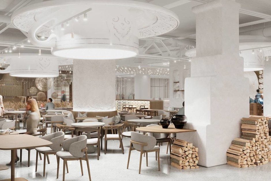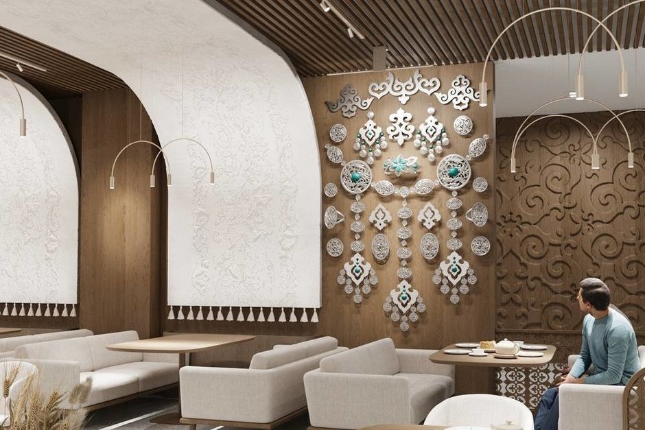 В зоне кухни появятся декоративные композиции из чак-чака. Рядом с обеденными зонами расположатся витрины с национальными ювелирными украшениями. Декоративное оформление включает множество элементов: ботанические барельефы, орнаменты из гипсовых беккенов и эчпочмаков.