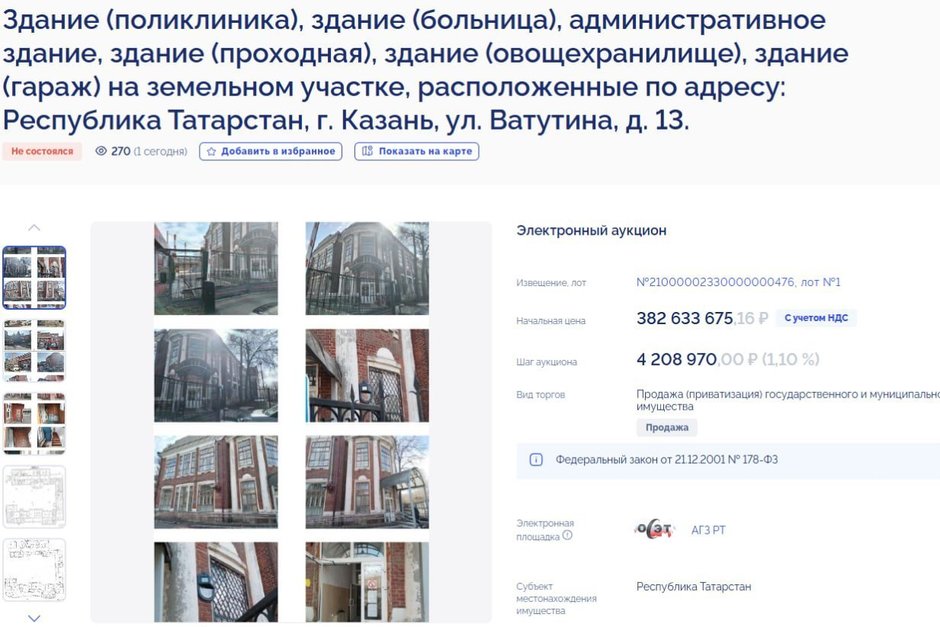 Аукцион по продаже исторического комплекса зданий на улице Ватутина, 13 в Казани не состоится. Торги были запланированы на 24 марта 2026 года, но признаны несостоявшимися из‑за отсутствия допущенных к участию претендентов. Соответствующая информация опубликована на ГИС «Торги».