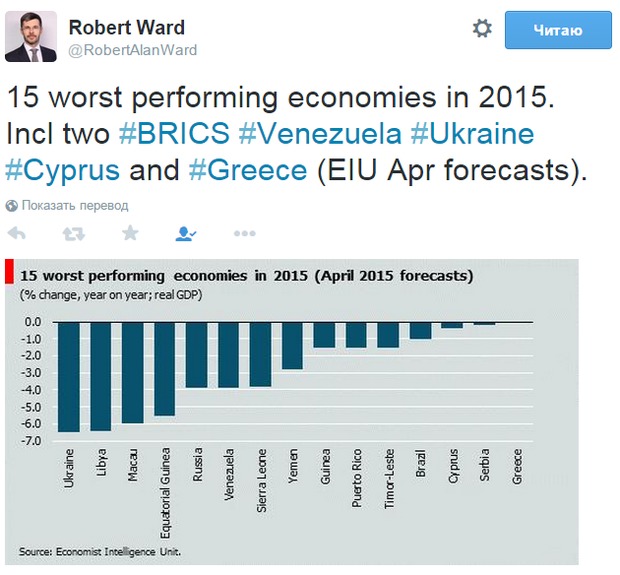 Журнал The Economist составил список из 15 стран с худшей экономикой на апрель 2015 года. Возглавила рейтинг Украина. Россия заняла пятую строчку. График исследования в своем Twitter опубликовал руководитель подразделения The Economist Intelligence Unit Роберт Уорд.