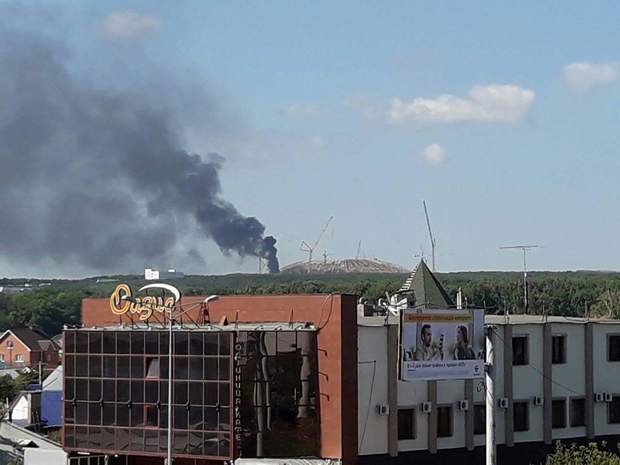 Судя по фотографиям, столб черного дыма виден из разных точек города, при этом открытого пламени на кадрах не наблюдается.